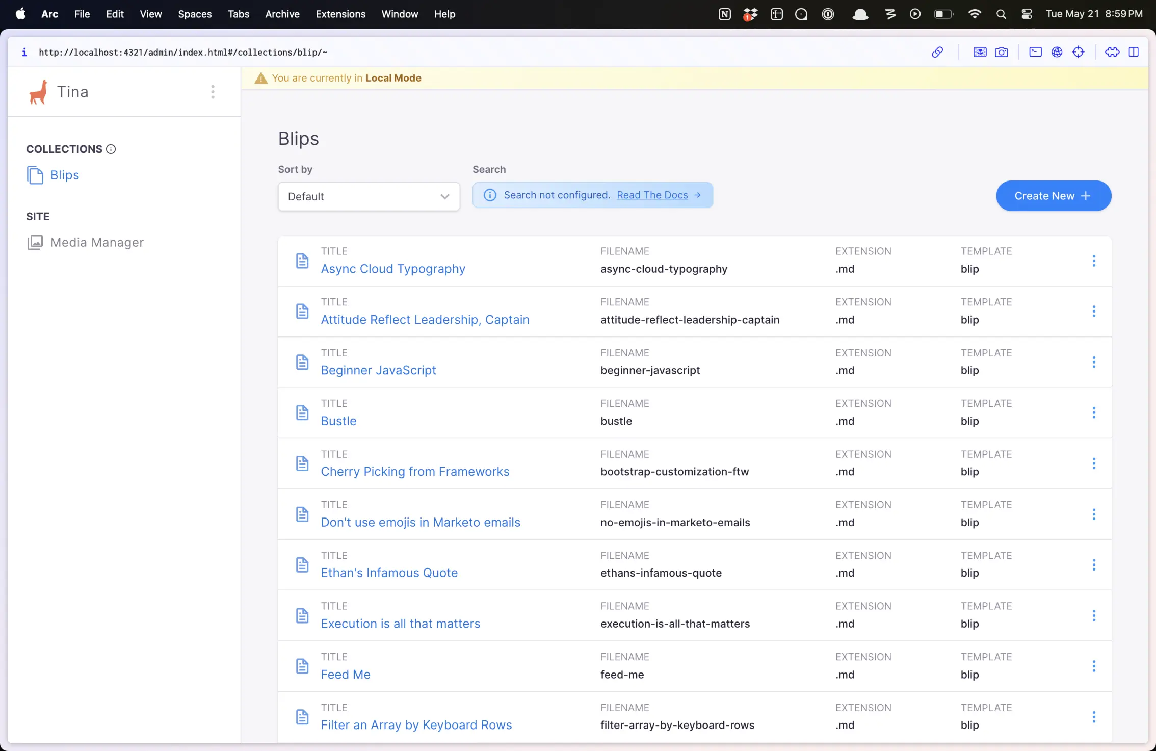 I was intrigued by Forestry.io originally during my Gatsby era, but I didn’t get around to installing it before it evolved to Tina, and I wanted out of Gatsby. It has resurfaced for me recently since Cassidy shared that she uses it, and there was news that the team got acqui-hired. Those things can be scary, but this one seems very positive. Plus, I have very little to lose because of the way that Tina works.