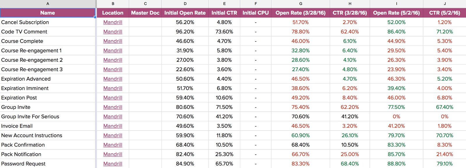 In studying successful product teams, I’ve found that most of them document projects (features, campaigns, etc.). I also saw that our teammates at Pluralsight create great kickoff docs for email campaigns. So I kind of made a frankenbaby of them for each of our emails. (I have not gone through and done them for all existing emails yet, but it’s a bucket list item.)